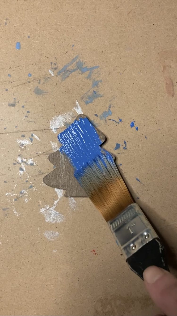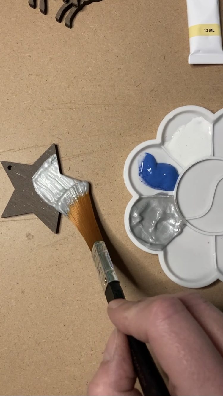 J’ai choisi quatre couleurs parce que j’ai quatre compartiments dans mon plateau. J’ai peins chacun d’une couleurs, puis les deux formes par compartiments de la même couleur. Les étoiles en argenté, les sapins en bleu foncé et ainsi de suite.