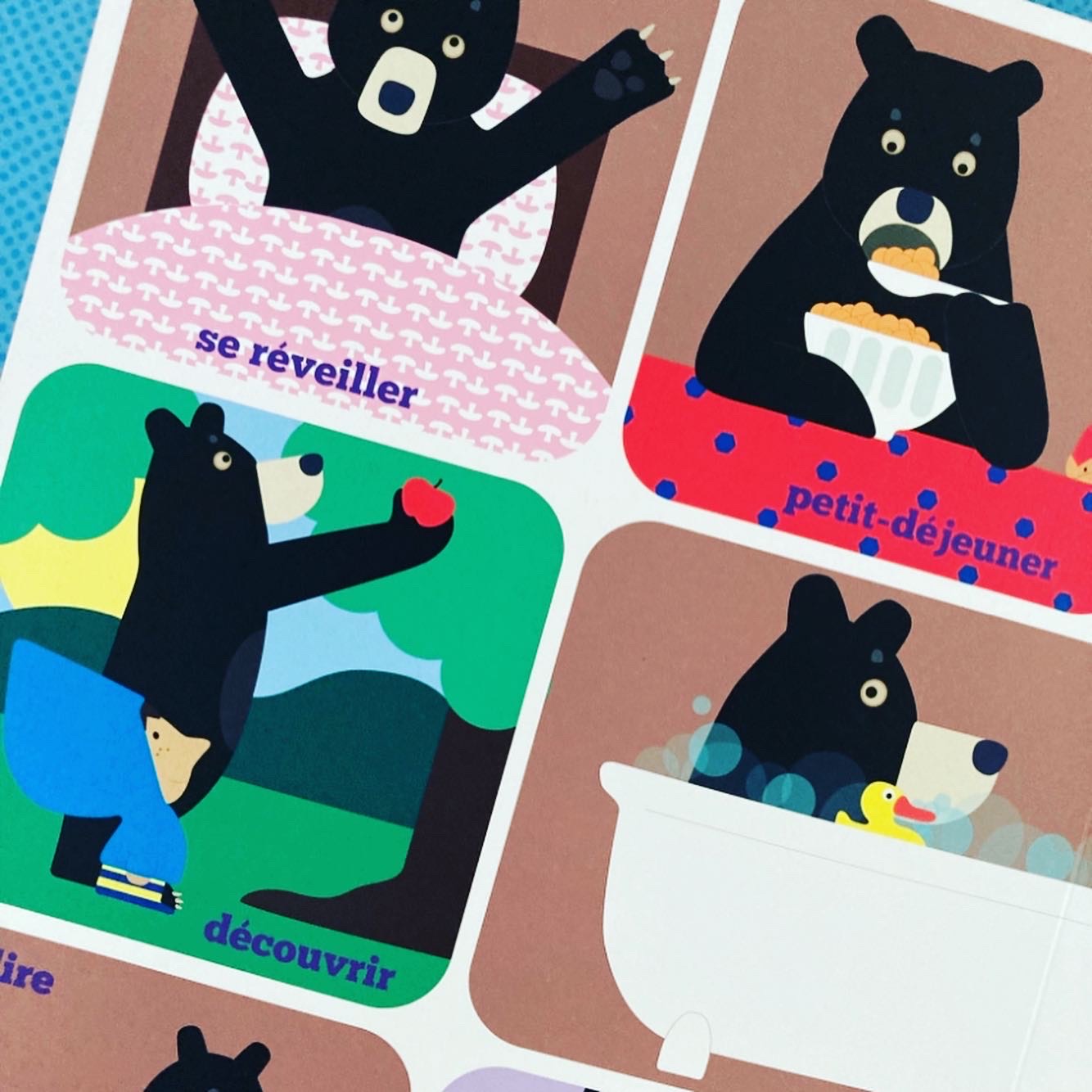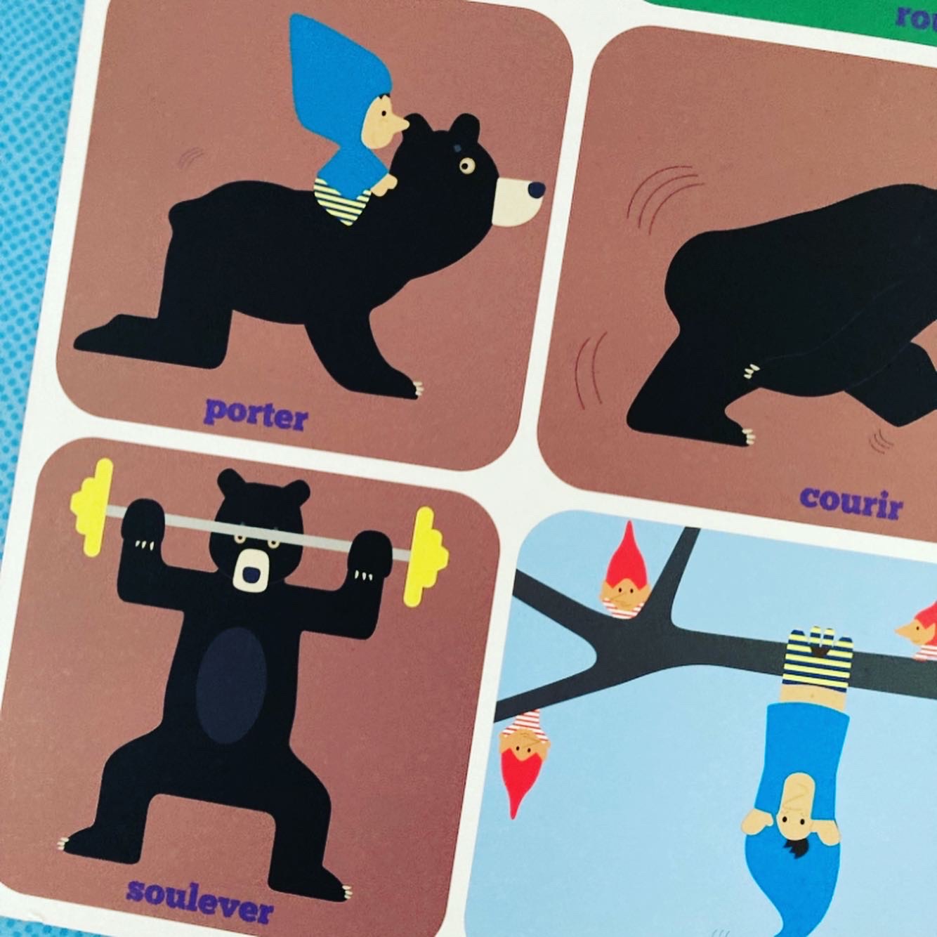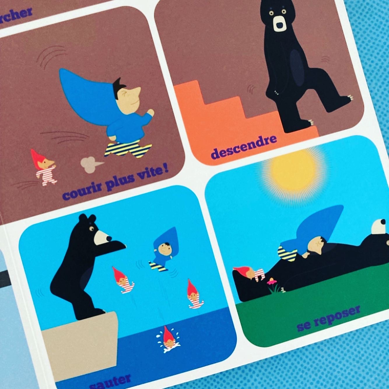 Il est en entièrement cartonné mais reste très léger, les illustrations sont simples mais très chouettes. Tous les personnages sont attachants aussi bien le gros ours que les petits lutins qui lui tiennent compagnie. Et comme je vous le disais plus haut, on retrouve pleins de vocabulaire différent ce qui le rend très intéressant pour échanger.